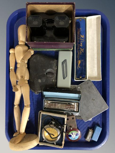 A group of harmonicas / mouth organs, a Viewmaster, wooden articulated doll, voltmeter, etc.