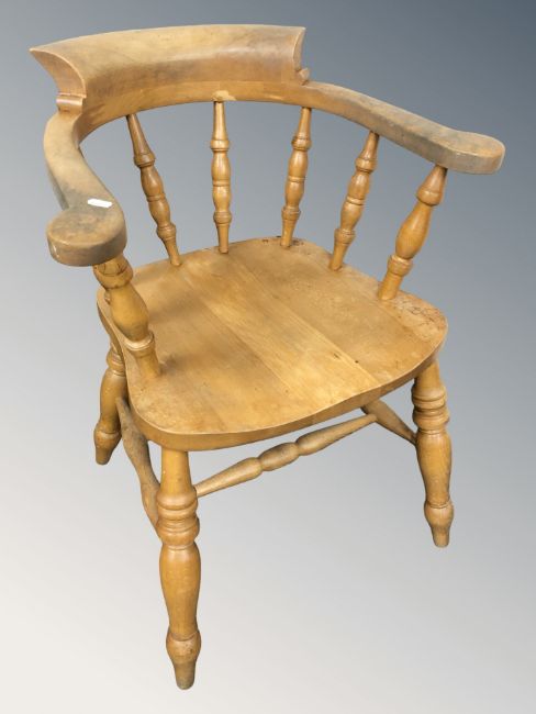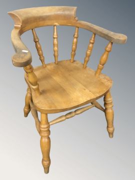 A pine spindle back elbow chair, width 61 cm.