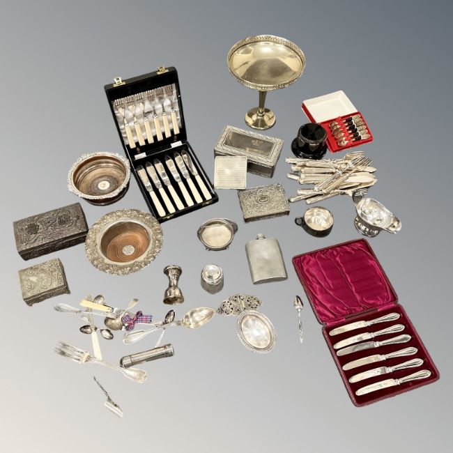 Assorted silver plated, pair of bottle coasters, cased and loose cutlery, nurse's buckle, trinket boxes etc