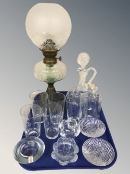 An oil lamp and a group of Scandinavian glassware including Holmegaard and other tea light holders, decanter, glasses, etc.