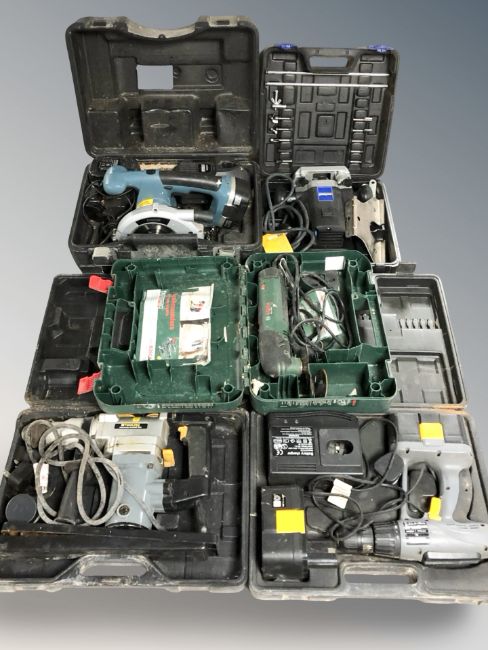 Five boxed hand tools including router, Erbauer circular saw etc
