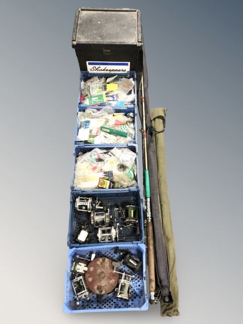 A large group of fishing related items including rods, reels, three crates of fly fishing related items, Shakespeare fishing tackle box etc