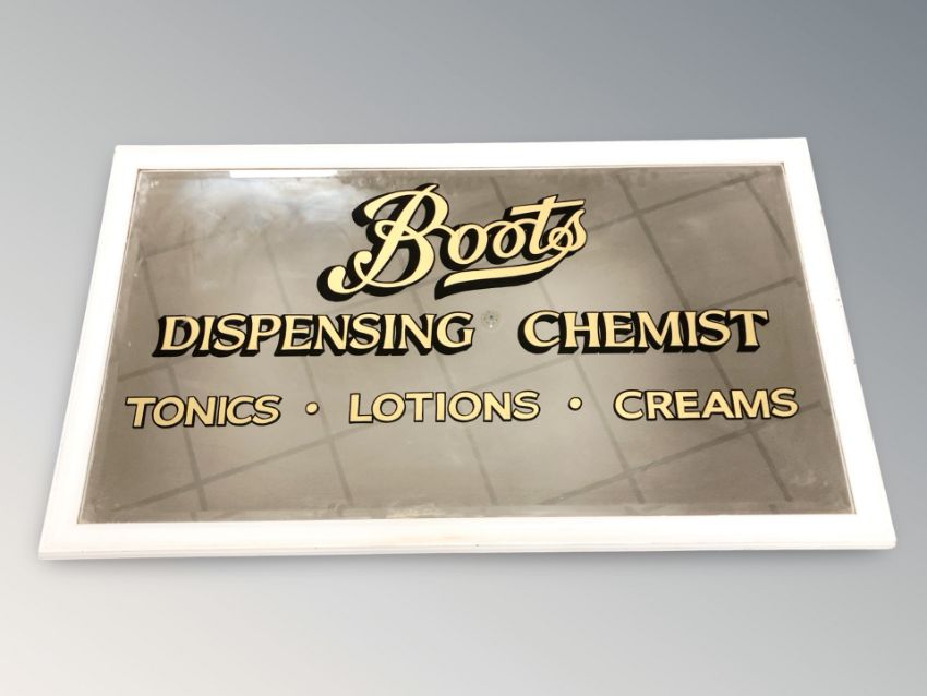 An advertising mirror "Boots Dispensing Chemist", 114 cm x 65 cm