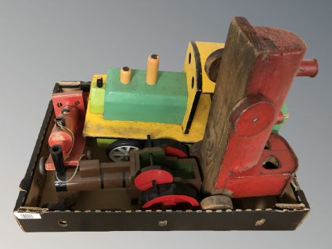 A box containing wooden nursery toys, model train.