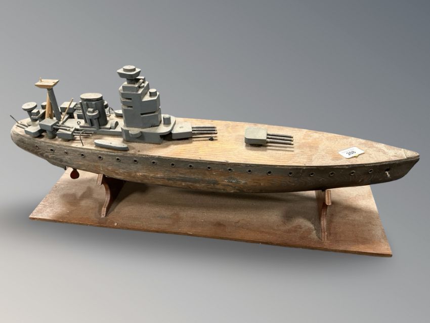A vintage wooden military battleship on stand, length 74 cm