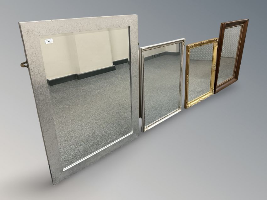 A contemporary silvered mirror, 71.5 cm x 99 cm, together with three further contemporary mirrors.