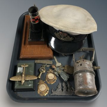A tray of Navy hat, miniature figure, model aircraft paperweight etc