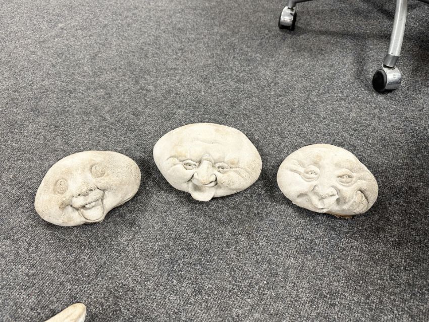 Three concrete face ornaments.