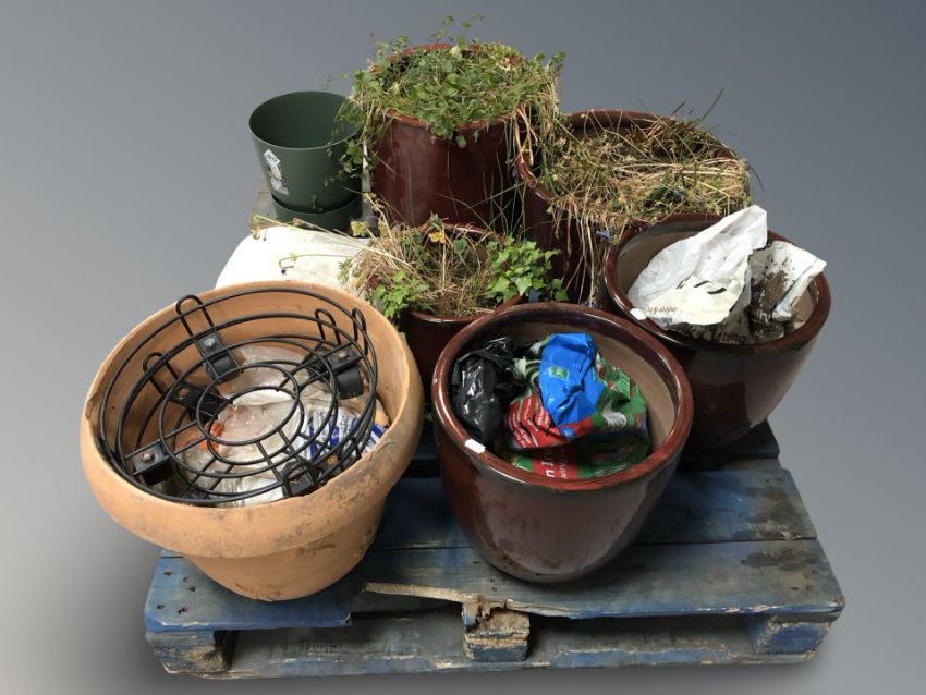 A pallet of garden plant pots, terracotta plant pot and bag of gravel.