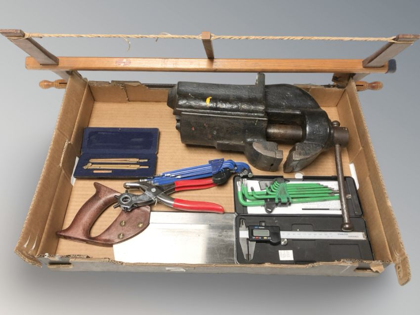 A box of large metal vice, Allen keys, saw, precision measure etc