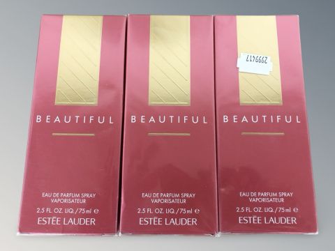 Three Estee Lauder Beautiful eau de parfum sprays, 75 ml, in cellophane wrapping.