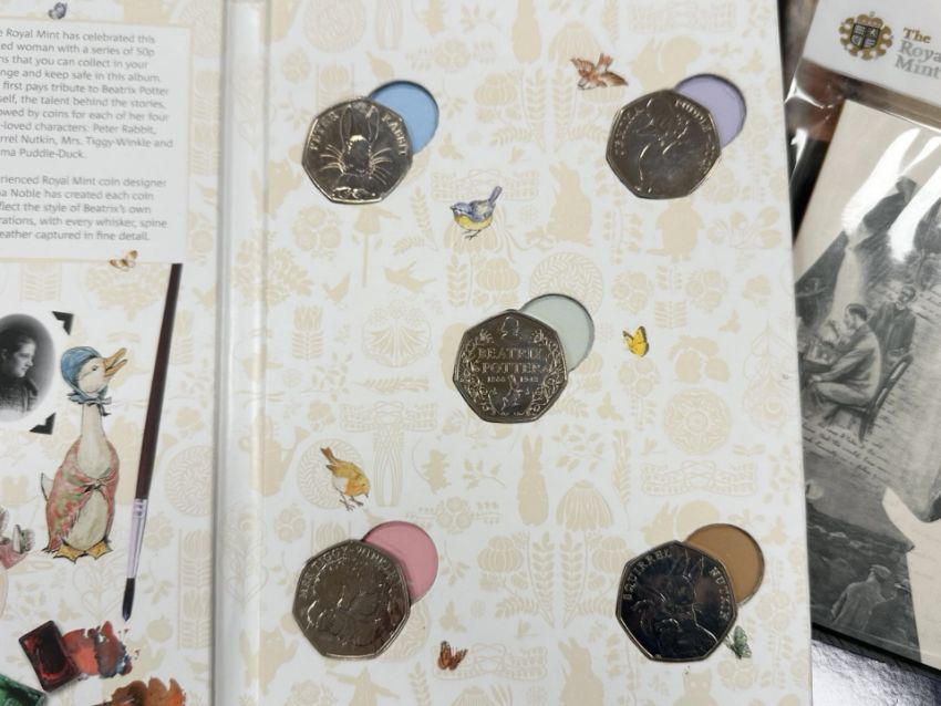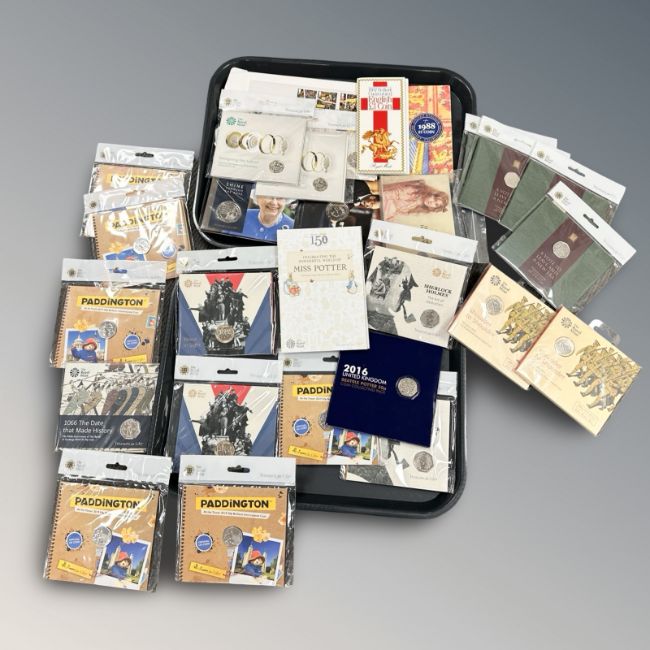 A collection of Royal Mint-issued proof coins, including Anniversary of the First World War, Sherlock Holmes, Paddington Bear, Beatrix Potter, 950th Anniversary of the Battle of Hastings, etc (two trays)