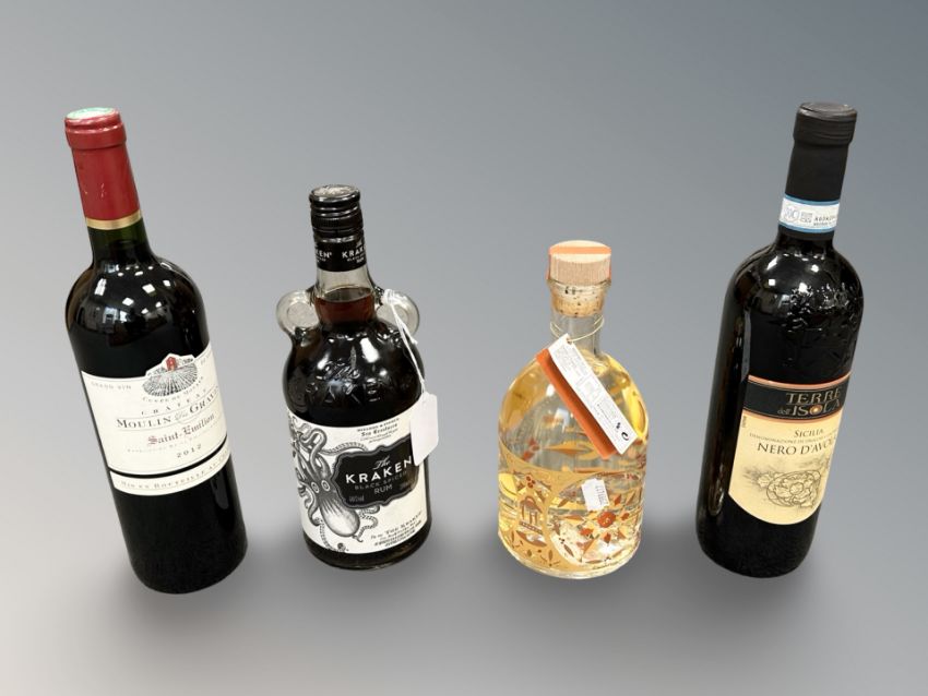 Four bottles of alcohol to include The Kraken black spiced rum 700ml, 2012 Moulin red wine, Terre Dell Isola red wine and Clementine light up snow gin liqueur 70cl.