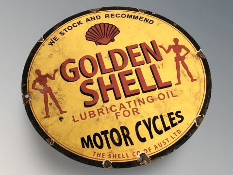 An enamel metal sign 'Golden Shell' diameter 30 cm