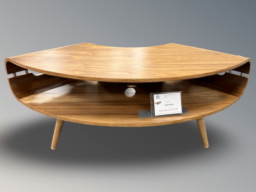 A contemporary curved laminated teak entertainment stand, width 130 cm.