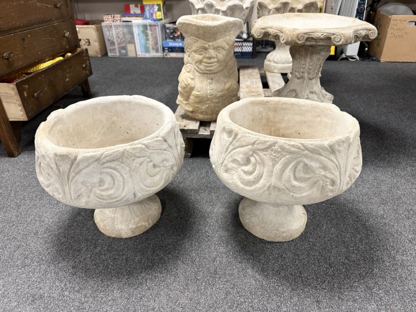 A pair of concrete jardinieres on stands.
