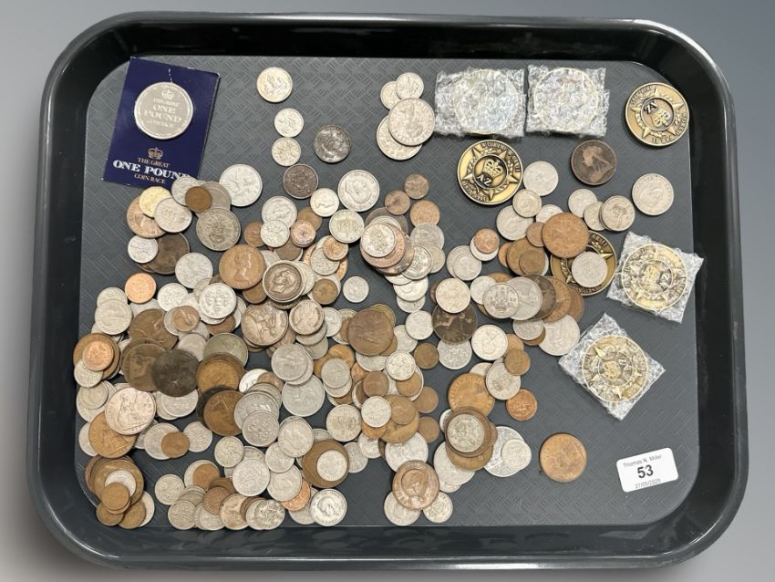 Mixed pre-decimal coins, reproduction tokens etc (one tray)