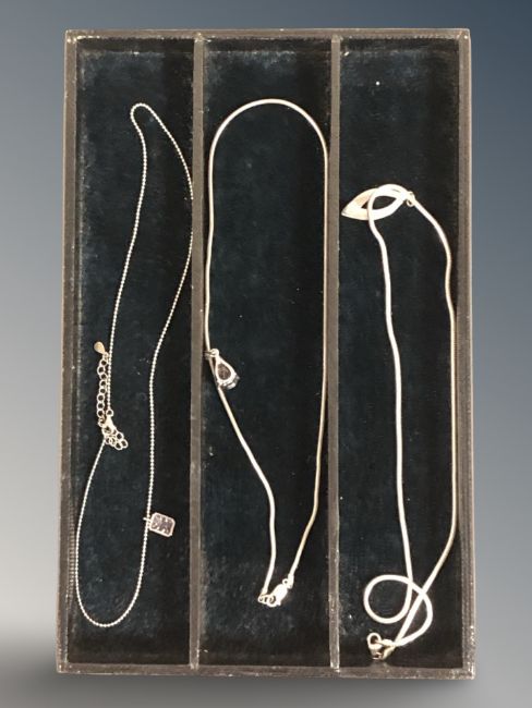 Three silver necklaces with pendants.