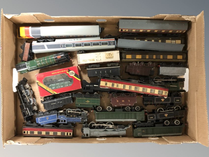 A group of model railway locomotive engines, carriages, tenders, etc.