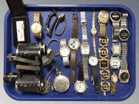A pair of German Dienstglas 6x30 binoculars, together with a lighter and a quantity of lady's and gents wristwatches including Citizen, a modern full hunter pocket watch, etc.
