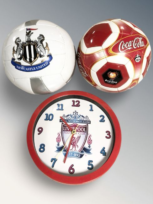 A Coca-cola football together with Newcastle United football and Liverpool FC wall clock