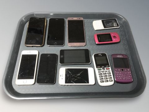 A group of mobile telephones including Doro, Nokia, Samsung, Apple iPhone, etc.