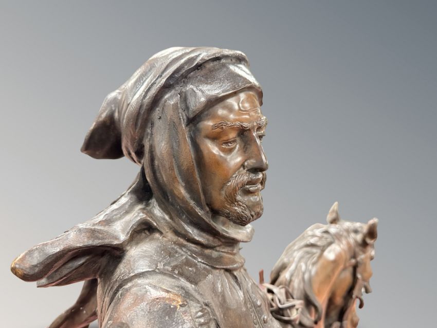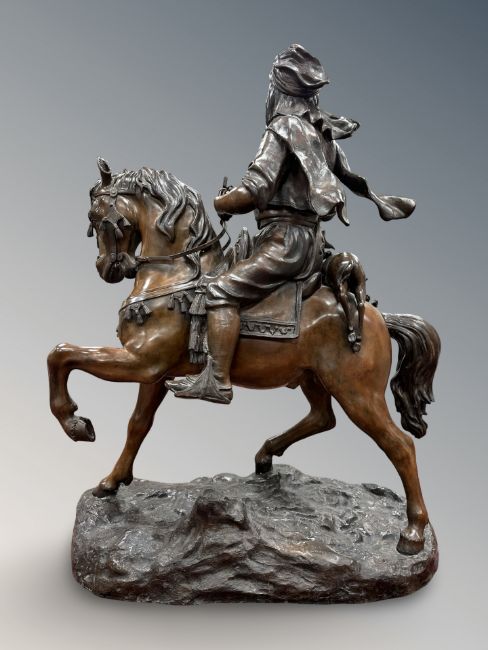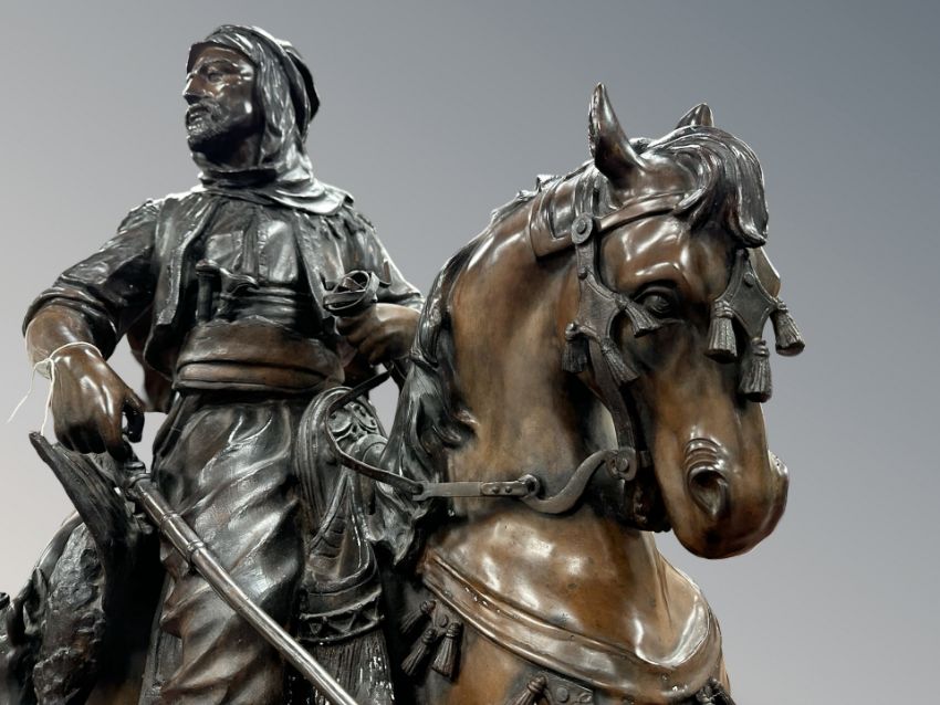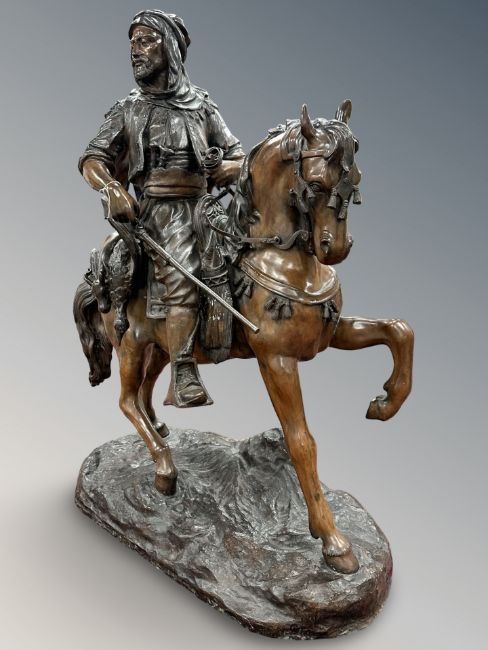 After Barye Fils & Emile Guillemin: An impressive bronze statue modelled as an Arabian huntsman on horseback, game tied behind him, with a rifle by his side, on an oval-shaped naturalistic base, 84 cm x 40 cm x 110cm.