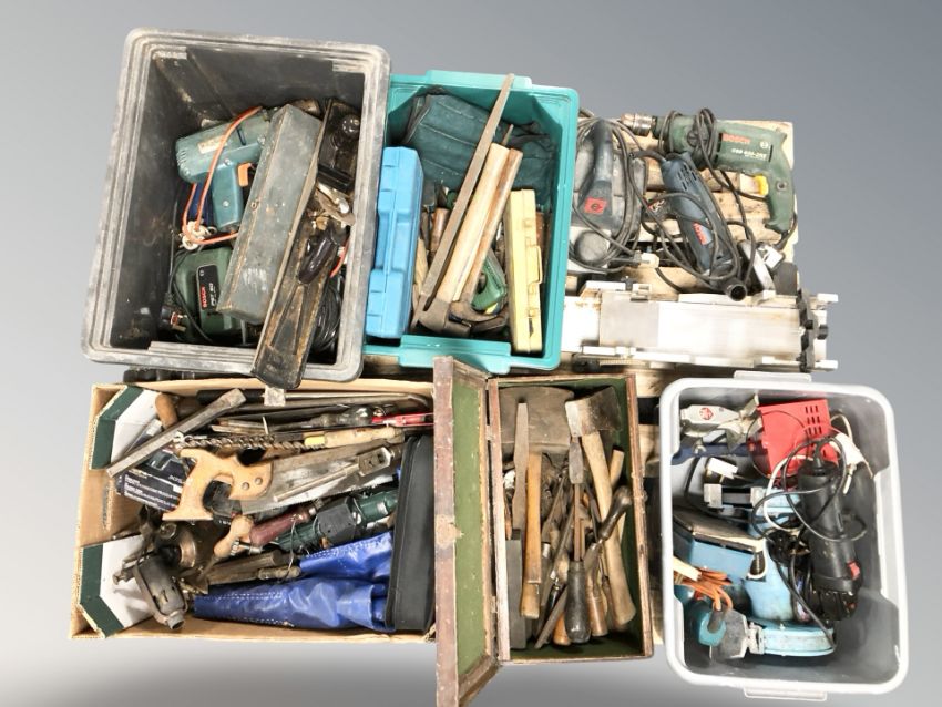 A pallet containing tools, hand tools, wood working chisels, Bosch drills, router, electric grinder, Stanley Bailey No.7 plane etc