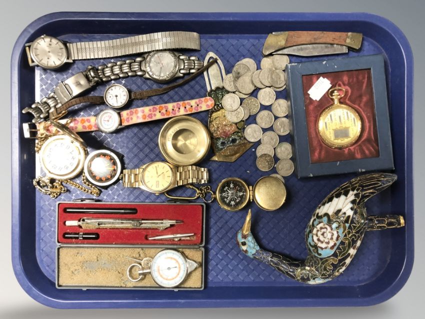 A group of collectibles including cloisonne figure of a bird (af), wristwatches, pocket watch, sixpence piece coins, etc.