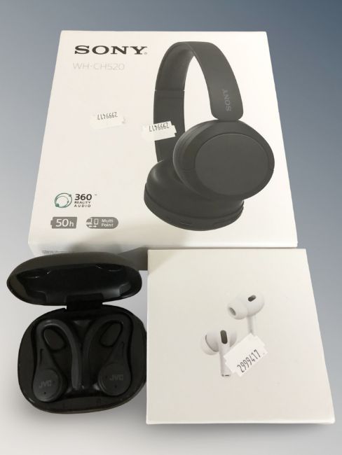 A pair of Sony WH-CH520 wireless stereo headphones, a pair of Apple Airpods Pro (2nd generation) in cellophane wrapping and a pair of JVC wireless earbuds in case.