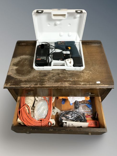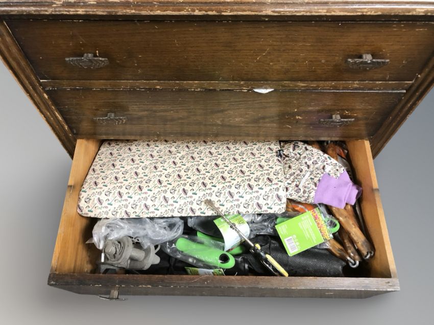 A 1920's oak three drawer chest containing a large quantity of tools.