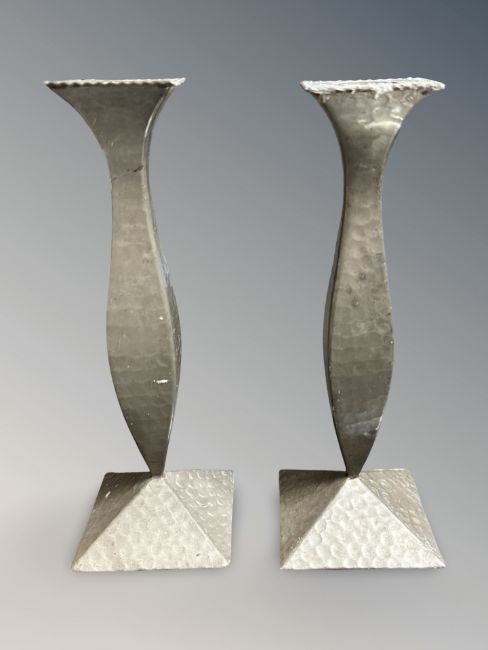 A pair of hammered pewter Arts and Crafts style candlesticks