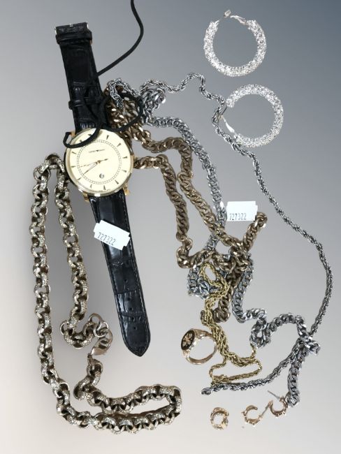 A gent's Emporio Armani gold plated quartz calendar wristwatch, case 45 mm, together with several costume chain necklaces, a signet ring, pair of hoop earrings, etc.