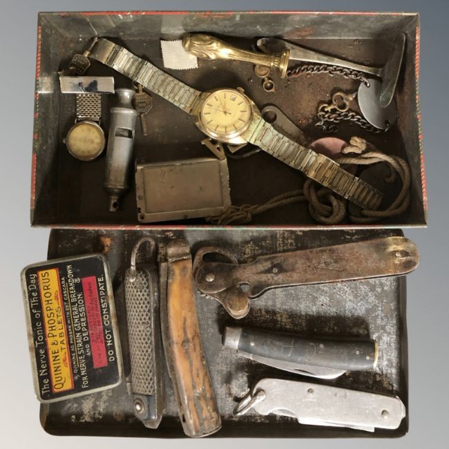 A group of antique folding knives, a desk seal, a pair of dog tags named to Pinkney CE 1139210, a bottle opener, vesta case, an Acme scout whistle, etc.