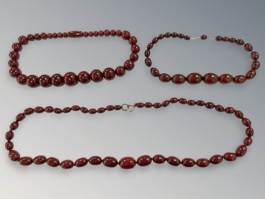 Graduated necklace with screw clasp length 54 cm gross weight 124.8g, Graduated necklace with circular spring clasp length 89 cm gross weight 100.7g, Graduated necklace with white metal clasp length 45 cm gross weight 64.7g.