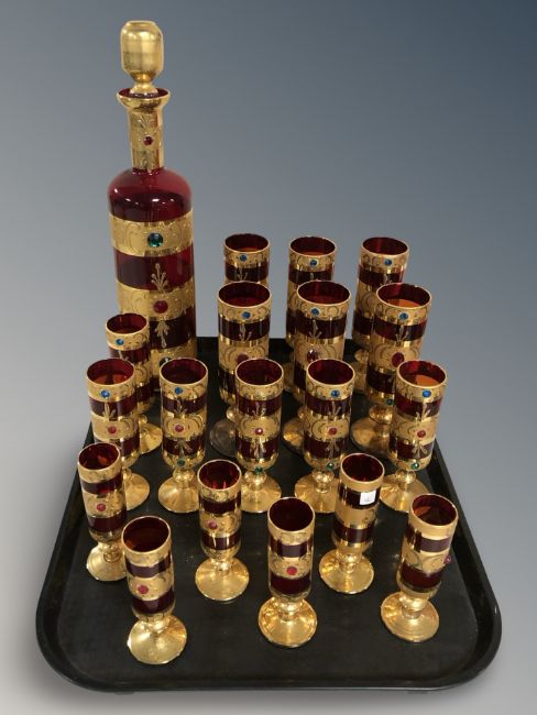A group of red glass gilded goblets with decanter
