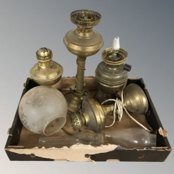A group of brass paraffin lamps with etched glass shade and two glass chimneys.