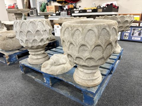 A pair of concrete pineapple garden urns.