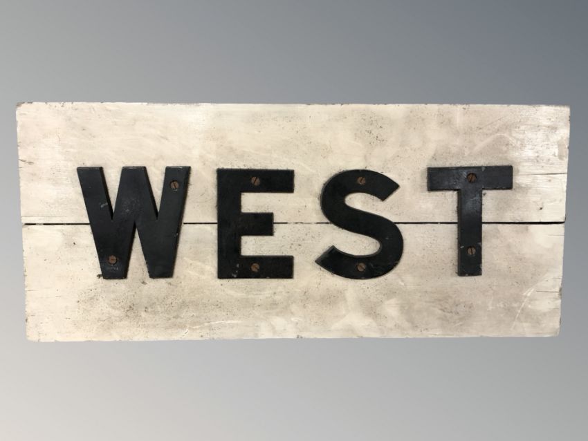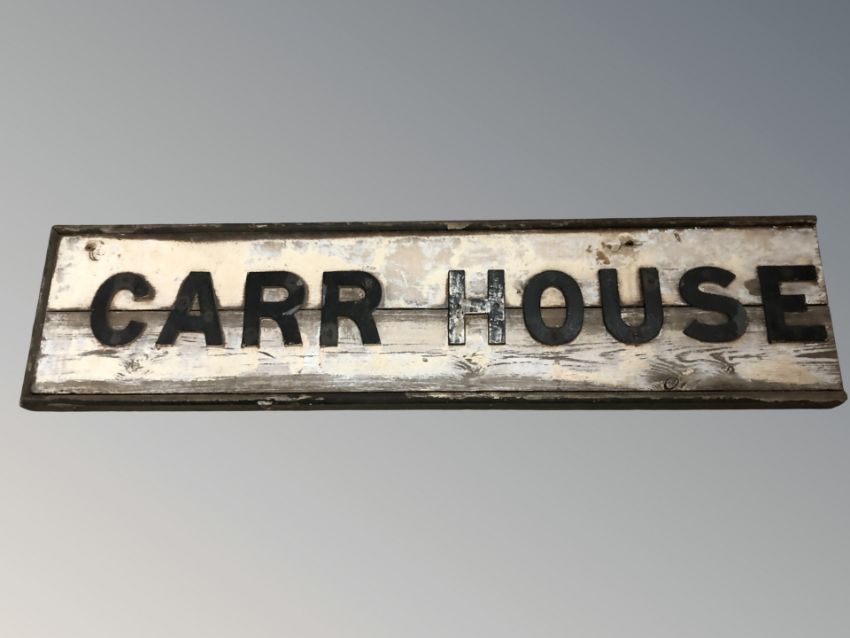 An antique wooden railway related sign, titled 'Carr House West', in two sections, largest length 129 cm.