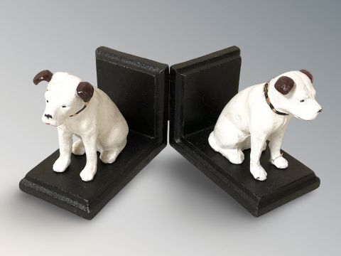 A pair of cast iron HMV dog bookends, height 12 cm.
