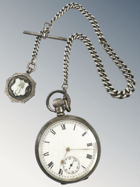 An antique silver pocket watch suspended on graduated silver Albert chain with enamel fob