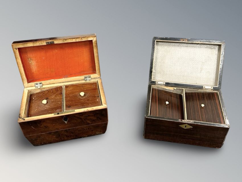 A George III yew wood sarcophagus tea caddy, width 19 cm and a further rosewood tea caddy
