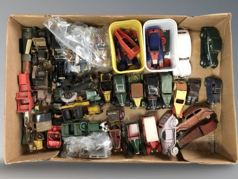 A group of hand made wooden miniature models of cars, die cast cars, etc. (1 box)