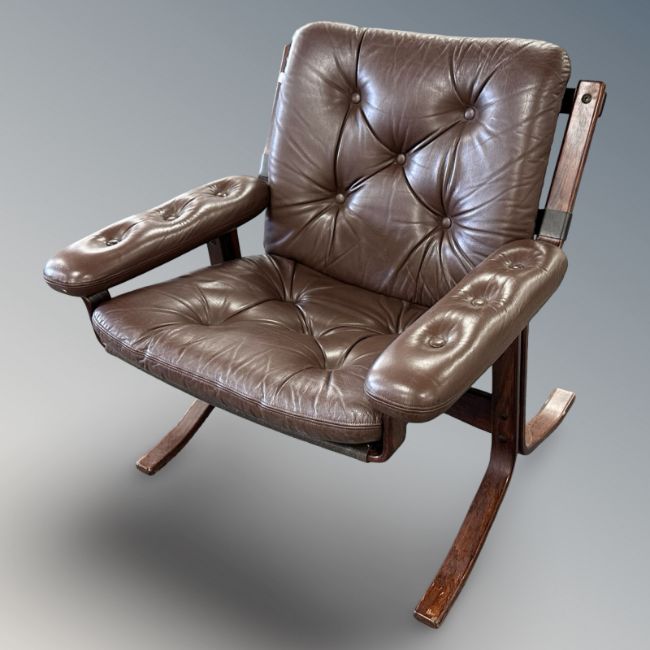 A Danish stained bent wood and button brown leather armchair, width 82 cm