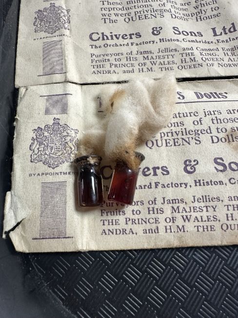 A group of antiquarian postcards, various coins, crowns, miniature dolls house jars, badges, a World War I Victory medal named to 153258 GNR. G. Dalgliesh, R.A.