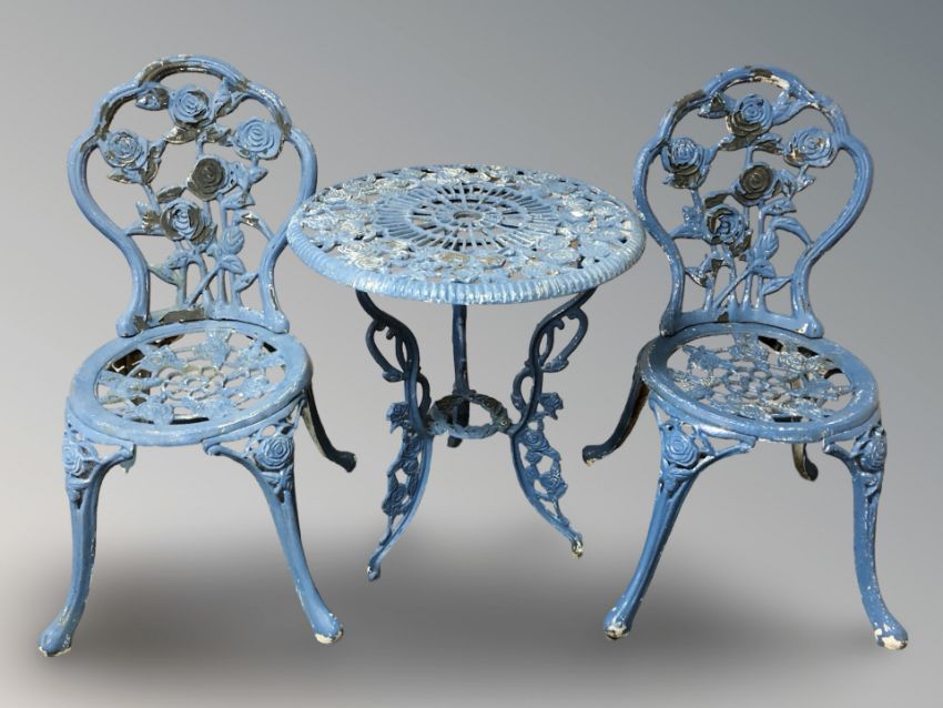 A painted cast iron patio table, 59 cm diameter, and two chairs