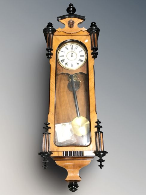 A walnut and ebonised Vienna eight day wall clock with enameled dial, pendulum and key, striking on a gong, height 130 cm.