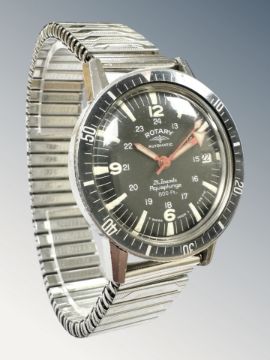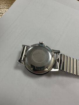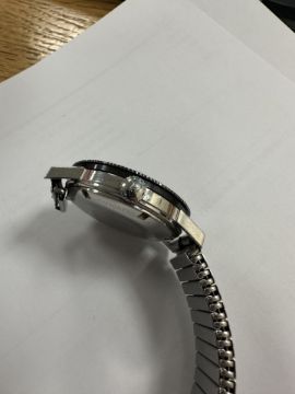 One of the end links of the bracelet has come loose since the watch was originally photographed. The case back is secured very firmly and I cannot open it, even with the appropriate tool. Therefore, the movement hasn't been seen. The crown is signed. The watch winds but does not run. The date changes correctly when the time is turned forwards. The bezel rotates. Typical minor scratches to case and glass.