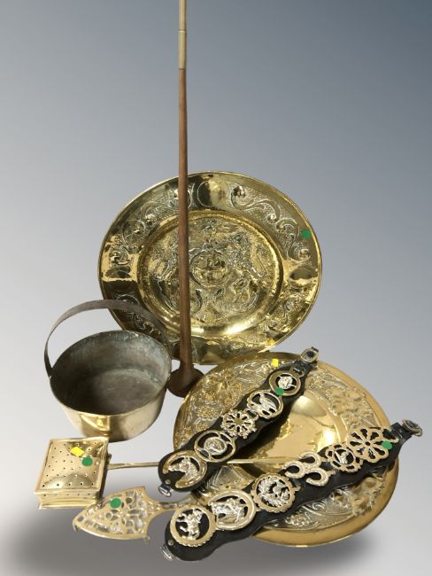 Two brass chargers, horse brasses, jam pan, a copper and brass horn. (1 box)