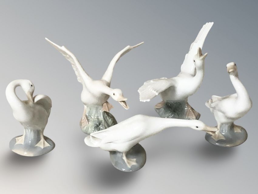 Five Lladro geese, largest 15 cm long.